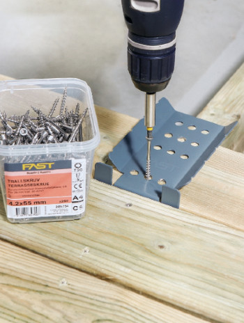 Deck Mate är anpassad för trallbrädor med bredderna 95/120/145 mm. Mallens hålbild är utformad enligt Svenskt Träs rekommendationer för läggning av trall.
